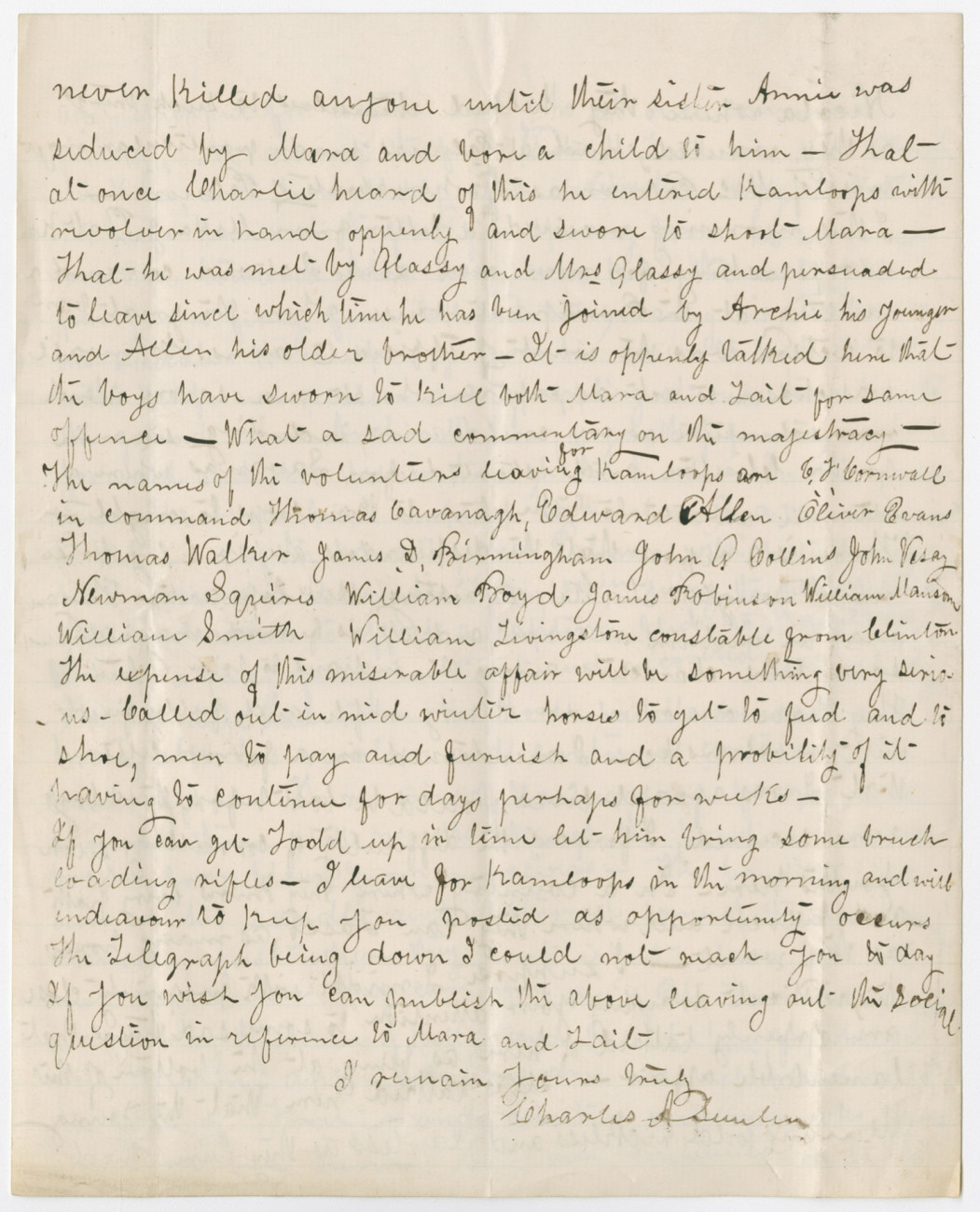 Allan, Charlie and Archie McLean were the younger sons of former HBC chief trader Donald McLean and his third wife Sophia Grant, daughter of a woman of the Colville Tribe. When Donald died in 1864, his sister refused to recognize the marriage, and claimed the estate, leaving the family with few resources. The fatherless boys were wild and lawless, but Semlin notes that they had never killed until they embarked on a rampage after learning that their sister Annie had been seduced and impregnated by John A. Mara, a local merchant, MLA and magistrate. Semlin describes the events leading up to the formation of a posse, and asks for help to equip it. He notes, “If you wish you can publish the above leaving out the social question” about Annie.