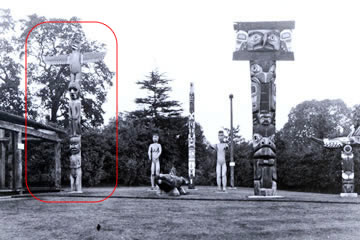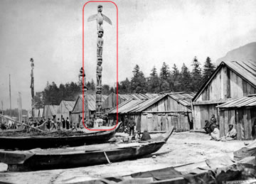 Une photo prise par Edward Dossetter en 1881 dans le village A’wa’eťala de Dzawadi du bras de mer Knight montre que de ce mât possédait à l’origine cinq personnages. Seuls les trois du haut furent acquis par Charles F. Newcombe en 1913.