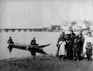Familles songhees avec une pirogue (du style de celles que l’on trouve dans le nord) dans la baie James en 1875. Le terrain du parc Thunderbird actuel se trouve au bord de l’eau, juste à gauche de l’emplacement où cette photo fut prise. Archives de la C.-B. : I-30804