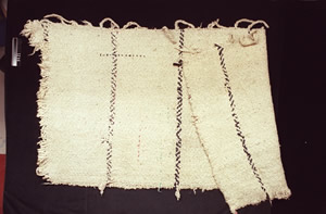 Cette couverture lukwungen est tissée de poil de chien, de laine de chèvre de montagne, de fibre d’ortie et de plumes. RBCM: 9421 |