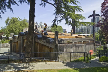 This is the second version of a traditional Haida house to be erected in Thunderbird Park. The first was destroyed by fire on July 28, 1980, while under construction.