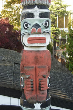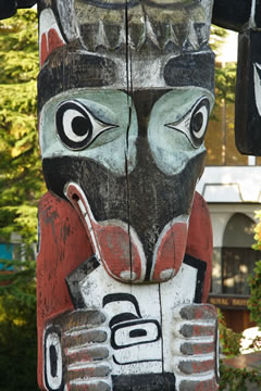 The pole is in front of Wawadiťła, the bighouse built by Mungo Martin in Thunderbird Park and opened in 1953. Rather than display his own crests on the pole, which was customary, Martin chose to include crests representing the A’wa’etłala, Kwagu’ł, ‘Nak´waxda’xw and ‘Namgis Nations. In this way, the pole represents and honours all the Kwakwaka’wakw people. RBCM 20122.